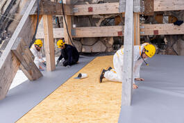 FRANCE. Paris, the 30th of august 2021. Notre-Dame of Paris' securisation and restoration process. Settling of "umbrellas" and metal floor upstairs above the neve and the core. South side of the cathedral.