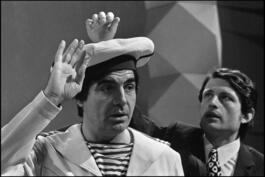 FRANCE. Ile-de-France Region. Paris.19th arrondissement. Studio des Buttes Chaumont. 34-36 rue des Alouettes / 10 rue Carducci. Rehearsal for the shooting of the musical TV show "Deux sur la 2". On the left side : Roger PIERRE, French actor. Tuesday January 26th, 1971.