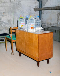 UKRAINE. Lviv. 13 March 2022. Water supplies in a bomb shelter located in the basement of the Lviv Regional Children's Specialized Hospital. Due to the constant threat of Russian shelling, patients and staff are forced to take refuge in shelters several times each day.