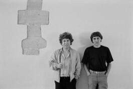 FRANCE. Ile-de-France region. Paris. 6th arrondissement. 20 rue des Grands Augustins. Under the porch of the MAGNUM agency. From right to left : French photographer Guy LE QUERREC, French jazz musician Louis SCLAVIS (clarinet, saxophone) photographed by Pascal FREY Magnum employee (salesperson). Thursday July 1st, 1982.