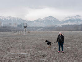 KAZAKHSTAN. Almaty. January 2022. A woman walking her dog near Sayran Lake in Almaty. She said ‘the police station in our neighbourhood was attacked three times. When I open the window I was smelling the gun powder. We couldn’t leave home for three days with fear.’