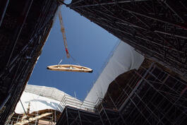 FRANCE. Paris, the 20th of july 2021. Notre-Dame of Paris securisation after the fire. A crane is lifting wood frameworks in order to consolidate the vaults in the transepts' crossing.
