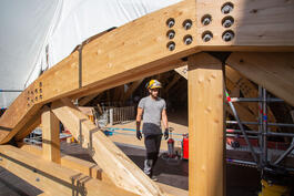 FRANCE. Paris, the 20th of july 2021. Notre-Dame of Paris securisation after the fire. A crane is lifting wood frameworks in order to consolidate the vaults at the north transept's crossing.