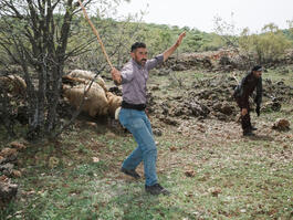 Turkey, Sirnak. 2021. Kudbettin 41 (L) and Izzet (R) lead their sheep. Kudbettin says ‘nomadic life style is hard, but other’s life is harder’.