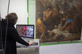 FRANCE. Bondoufle (91). 14 December 2021. Restoration tests for 17th-century paintings which were in Notre-Dame before the fire. Here: "La Lapidation de Saint Étienne" by Charles le Brun (1651). Restorer: Cinzia Pasquali.