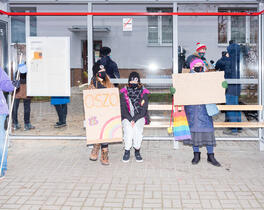 POLAND. Warsaw. 19 December 2020. A small protest mocking the inadequate police response to the recent Women's Strike. The group called Voluntary Ordinary Things Protection Unit (Ochotnicza Straż Zwykłych Obiektów- OSZO) gathered in a residential district of Warsaw to protect such places as bus stops, kiosques and police stations.