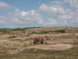 France, Normandy, Biville. 2020. Tourists seen near an abandoned war vehicle from the Second World War, in the dune of Biville. from the Second World War.