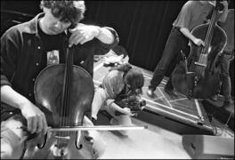 FRANCE. Pays-de-la-Loire region. Sarthe departement. Le Mans. Europa Jazz Festival, 18th edition. Abbaye de l'Epau, Route de Changé. In the foreground, French jazz musician Vincent COURTOIS (violoncello). In the background, from left to right : videographer Agnès DESNOS and, cut, French jazz musician Claude TCHAMITCHIAN (double bass). Rehearsal and soundcheck before the evening concert. FRANCOIS CORNELOUP "CALLIGRAPHES". Friday, April 25th 1997.