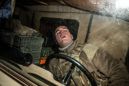 USA. Washington DC. 20 January 2021.Exhausted National Guard sleeps in the truck.