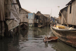 Makoko floating slum, an informal settlement located on the coast of mainland Lagos, Nigeria. Population is between 85 000 to 250 000. Makoko is sometimes referred to as the "Venice of Africa ».