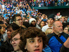 USA. Lansing, MI. 2024. The crowd gathers to hear Vice President Kamala Harris speak to voters in the Jenison Field House at Michigan State University on November 3, 2024.