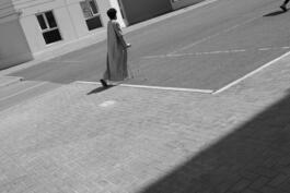 UAE. Abu Dhabi. 2024. A man walks in the Humanitarian City. The Emirates Humanitarian City is a housing complex in Abu Dhabi. It provides support and medical assistance to ill and injured Palestinians evacuated from the Gaza strip. Refugees from Gaza.