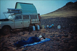 AFRICA. Mauritania. 1970. When travelling through West Africa on assignment for Encyclopaedia Britannica in a Land Rover, James Gale goes instantly to sleep on the stony ground.