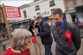 GB. England. Wiltshire. Salisbury. In the Market Square, a 'Vote Remain' table, manned by Labour and other remain supporters is set up to persuade those who are undecided to mark a cross in the IN box at the EU referendum on June 23rd. 2016