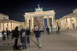 GERMANY. Berlin. 2024/3. Brandenburg Gate. Demonstrator with an image of Julian Assange.