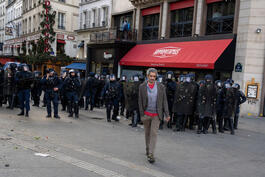 France. Paris. 2023. Police and protestor at Place de la Republique....