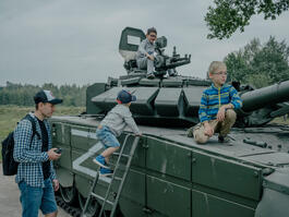 Children climbing on Russian tanks...