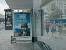 Billboard of a Russian soldier at a bus stop in Moscow.