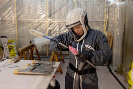 FRANCE. Corrèze. Liourdre. 22 April 2022. Restoration of around 6000 from the 8000 tubes of Notre-Dame's organ at Olivier Chevron's atelier, formerly the studio of famous organ builder Bertrand Cattiaux. Eva Delmas, Laurent Massalve and Gonzalo Frau working for M. Chevron.