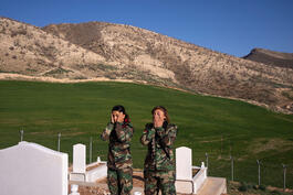 IRAQ. Near Erbil. 2023. Kurdish-Iranian female Peshmarga from PAK pray for the dead at a cemetery near their base. The dead Peshmarga were killed in the war against ISIS and by Iranian drone strikes. Names were not given for security reasons. PAK is the Kurdistan Freedom Party of Iranian Kurds, based in Northern Iraq. The party has between 600-1000 fighters, approximately 1/3 of them female. Founded in 1991, their aim is an independent Kurdish state. From 2014-2017 they were engaged in the battle against ISIS,and since the recent uprisings in Iran they have been subject to drone attacks from the Iranian regime.