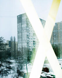 UKRAINE. Kyiv. 12 January 2023. Windows taped against the potential bomb explosion. It's been almost a year since the full scale invasion of Ukraine by Russia. The suburbs of Kyiv suffered from significant devastation of civilian infrastructure in the first phase of the war. Irpin, Hostomel and Bucha have become a symbol of brutal war crimes committed against civilians by the Russian soldiers. Ukrainians try to reorganize their lives after the withdrawal of the invading troops from the Kyiv region, but a large part of the destroyed residential districts, shopping centers and gas stations still remain abandoned and uninhabited. Many places have become the memorials of heavy fights and victories over the Russian army.