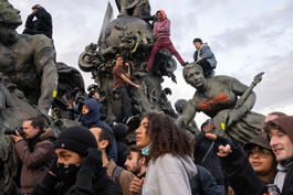 FRANCE. Paris. March 2023. Protestors gather on the statue in...