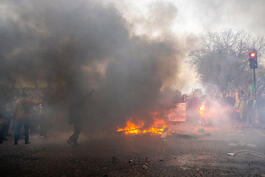 FRANCE. Paris. March 2023. Protestors set fires at the Place de la Concorde after the French government used Article 49.3 of the French Constitution to push a pension reform bill through parliament without a vote by elected lawmakers. The bill would raise the retirement age from 62 to 64 and has been the source of widespread protest across France since January.