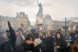 FRANCE. Paris. March 2023. Protestors during a protest at La Republique after the French government used Article 49.3 of the French Constitution to push a pension reform bill through parliament without a vote by elected lawmakers. The bill would raise the retirement age from 62 to 64 and has been the source of widespread protest across France since January.