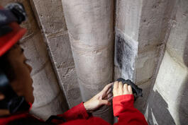 FRANCE. Paris. 10 September 2021. Notre-Dame de Paris. After having done a listing of 600 writings on walls of the cathedral, a team composed by Delphine Syvilay from LRMH and Santiago Hardy, a rope climber from Jarnias, they engrave the medieval inscriptions on a japanese paper with japanese ink. This technic is called "Taku-hon". This project has been done by LMRH and CNRS and is called: "Marques, traces et signes. Une autre lecture de Notre-Dame de Paris" under the GT Emotions patrimoniales. The location of these inscriptions is south east of the transept's crossing.