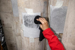 FRANCE. Paris. 10 September 2021. Notre-Dame de Paris. After having done a listing of 600 writings on walls of the cathedral, a team composed by Delphine Syvilay from LRMH and Santiago Hardy, a rope climber from Jarnias, they engrave the medieval inscriptions on a japanese paper with japanese ink. This technic is called "Taku-hon". This project has been done by LMRH and CNRS and is called: "Marques, traces et signes. Une autre lecture de Notre-Dame de Paris" under the GT Emotions patrimoniales. The location of these inscriptions is south east of the transept's crossing.