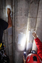 FRANCE. Paris. 10 September 2021. Notre-Dame de Paris. After having done a listing of 600 writings on walls of the cathedral, a team composed by Delphine Syvilay from LRMH and Santiago Hardy, a rope climber from Jarnias, they engrave the medieval inscriptions on japanese paper with japanese ink. This technic is called "Taku-hon". This project has been done by LMRH and CNRS and is called: "Marques, traces et signes. Une autre lecture de Notre-Dame de Paris" under the GT Emotions patrimoniales. The location of these inscriptions is south east of the transept's crossing.