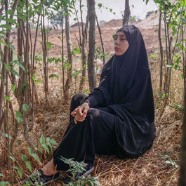 TURKEY. Istanbul. 2022. Şeyma leaning on a tree at a summertime picnic event organized by her Quran school.