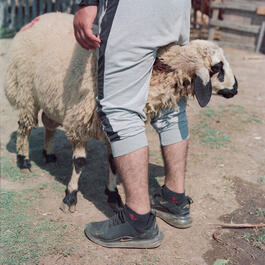 TURKEY. Istanbul. 2022. A man holds a sheep between his legs before the sacrificing ritual. Eid Al-Adha ('Feast of the Sacrifice') is one of the oldest Islamic holidays in Turkey. It commemorates the story about Prophet Ibrahim (Abraham) who showed obedience to God by agreeing to sacrifice his son. God then sent him a ram to be sacrificed instead.
