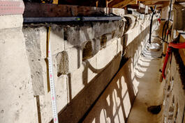 FRANCE. Paris, the 26th of october 2022. restoration of Notre-Dame of Paris. Apparatus (appareilleurs), all companions, from Lefevre company including Marina Toullec, assistant apparatus taking measures on the balustrade of the terrasse at the second floor on the heart side of the cathedral.