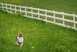 NORWAY. Breivoll. 2020. Billie picking flowers. Photographer's family during the COVID-19 coronavirus pandemic.