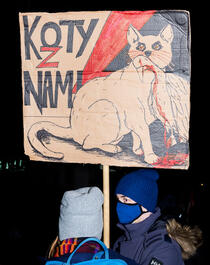 POLAND. Warsaw. 27 January 2021. Following the politicized Constitutional Court's declaration of a bill that bans nearly all abortions, people took to the streets all over Poland. Almost 100 days passed between the declaration and implementation of the bill. Banner saying: The Cats Are With Us