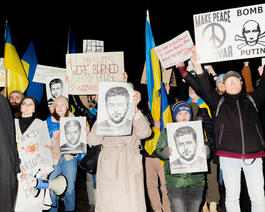 POLAND. Warsaw 03 March 2025. “Urgent protest in defense of Ukraine” in front odf US Embassy in response to Donald Trump and Volodymyr Zelensky’s meeting in the Oval Office on 01.03.2025 banners with Zelensky's portrait say: glory to the heroes