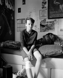 GB. England. Hull. 2017. Kasper with a broken knee photographed in his bedroom.