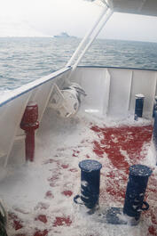 NORWAY, Svalbard, off Longyearbyen, 2025/3. Tourist boat cruise North from Longyearbyen into the fjords towards Pyramiden. Looking for walrusses, polar bears. Norwegian coats guard vessel.