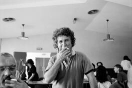 FRANCE. Pays-de-la-Loire region. Sarthe department. Chantenay-Villedieu. "Vite faite sur le Chantenay-Villedieu" Festival. French photographer Guy LE QUERREC. Lunch in the canteen with the musicians. Sunday 5th September, 1982.