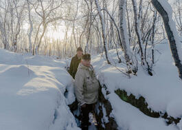 Konstantin Dobrovolski and Alexei Smolev (back) walking trough German trenches from World War II.