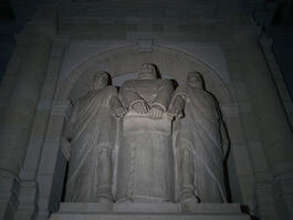 SWITZERLAND. Bern 2022. The sculpture "Die drei Eidgenossen" "The Three Confederates", at entrance hall of Federal Palace. Live Lab Bern, multimedia project SESSION photographed during summer session 2022 at Federal Palace of Switzerland for the 175. anniversary of the Federal Constitution in 2023.