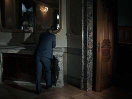 SWITZERLAND. 2022. One man from behind talking on the phone at Federal Palace. Live Lab Bern, multimedia project SESSION photographed during summer session 2022 at Federal Palace of Switzerland for the 175. anniversary of the Federal Constitution in 2023.