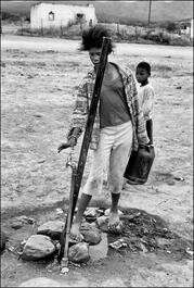 SOUTH AFRICA. Cape Province. Oudtshoorn. 2003. Coloured children of farm labourers on a White owned farm find their only tap cut off whilst the farmer waters his crops.