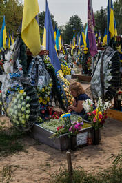 UKRAINE. August 2023. Woman mourns at military cemetery, Lisove Cemetery, Kyiv