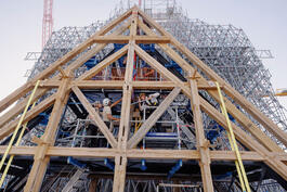 FRANCE, Paris, the 05th of september 2023. Reconstruction of Notre-Dame of Paris' cathedral. The scaffolding which surrounds the new spire under construction and lifting and posing of a "farm", wood framework by carpenters above the neve.