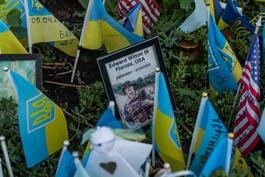 UKRAINE. August 2023. Portrait of fallen soldier within flags...