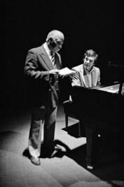 FRANCE. Paris. 4th arrondissement. Theatre de la Ville. 1st edition of the Paris Jazz Festival. From left to right: US jazz musician Kenny CLARKE (drums) and French jazz musician Rene URTREGER (piano). During the rehearsal and soundcheck for the evening concert in 1st part at 20:30pm. RENE URTREGER QUINTET. Sunday 2nd November, 1980.