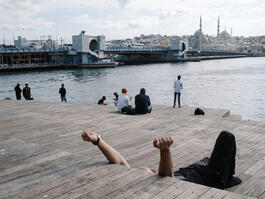 TURKEY. Istanbul. 2022. People enjoy the nice weather near Galata...
