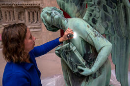 FRANCE. PARIS, october 29th of 2019. Palais de Chaillot. Two sculptures of brass which were around the spire of Notre Dame cathedral before its restoration are shown at Cité de l'architecture at Trocadero as well as the coq which was at the top of the spire during the fire. Aurelia Azema and Delphine Syvilay two ingeneers specialised on metal and working at the LRMH laboratory, are making several analysis and researches.